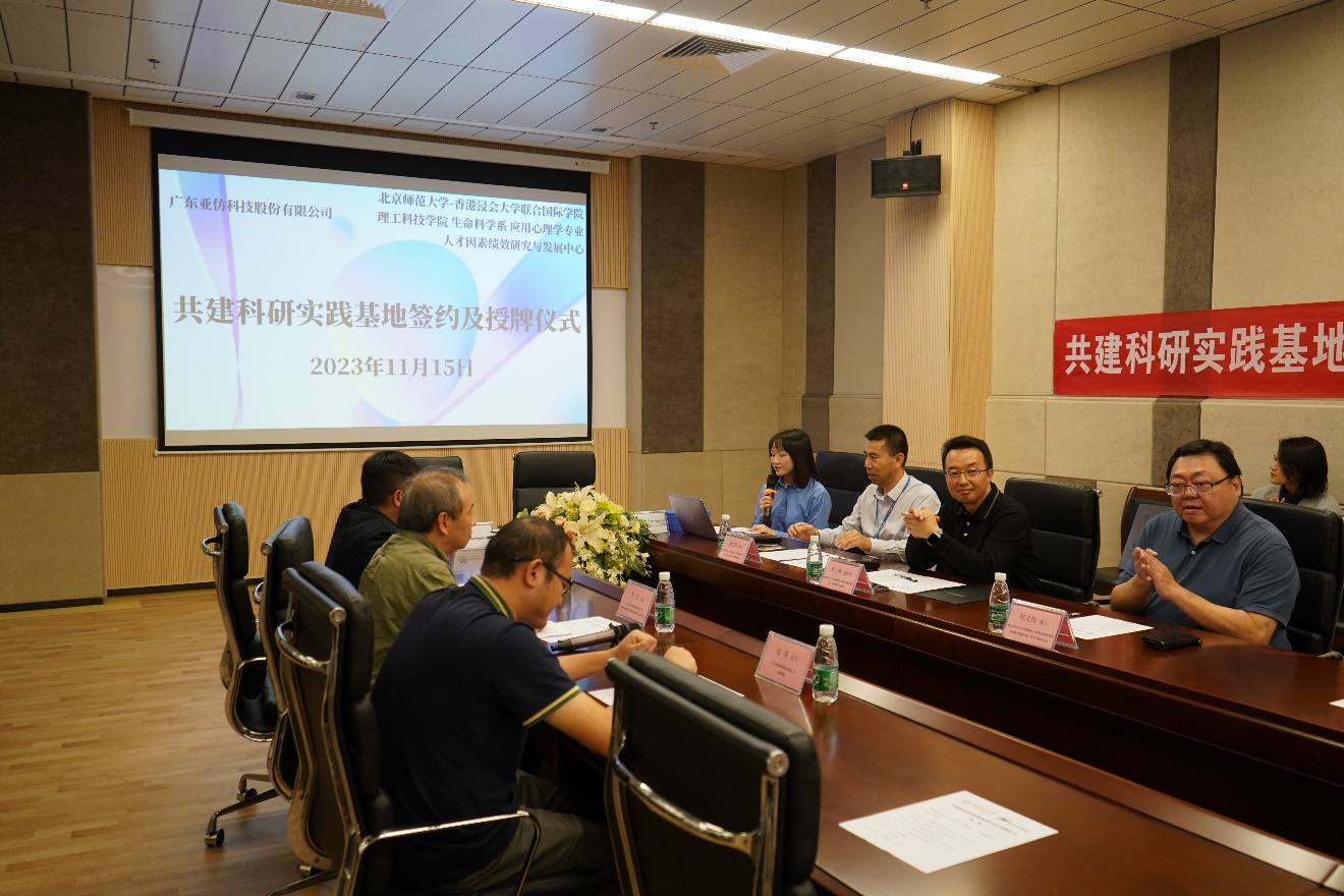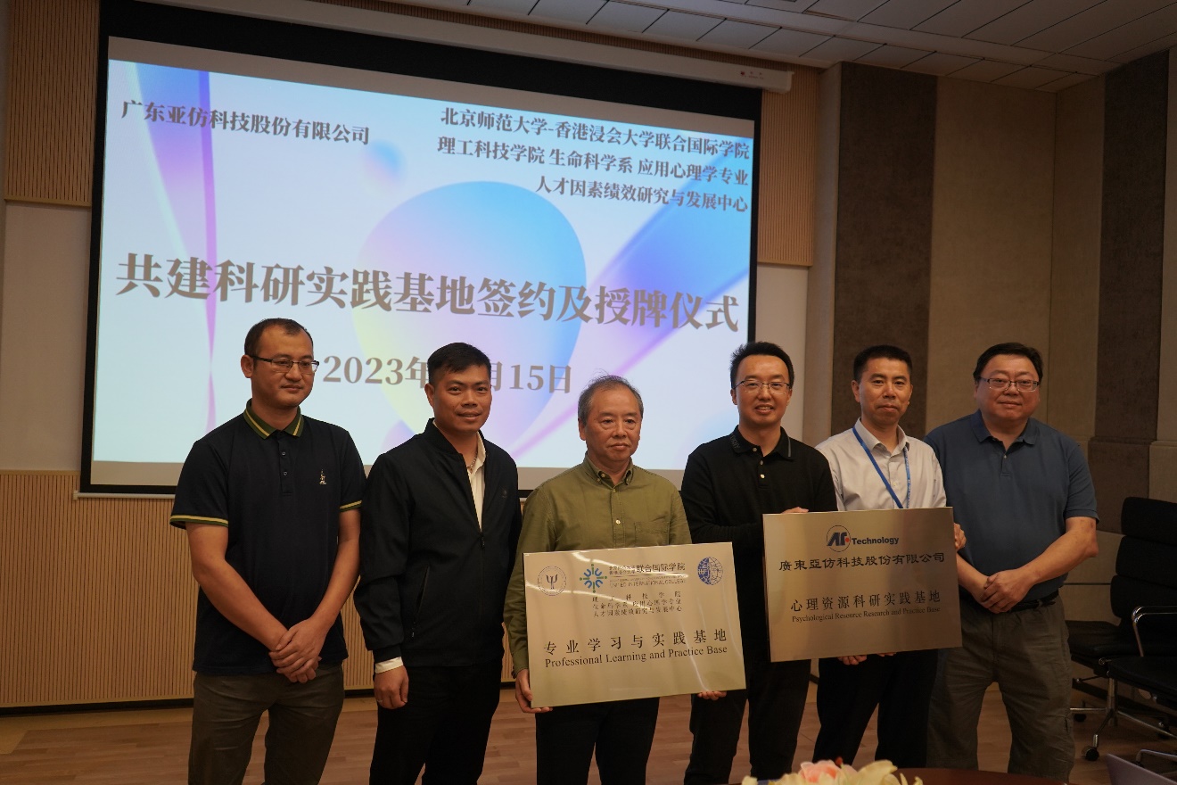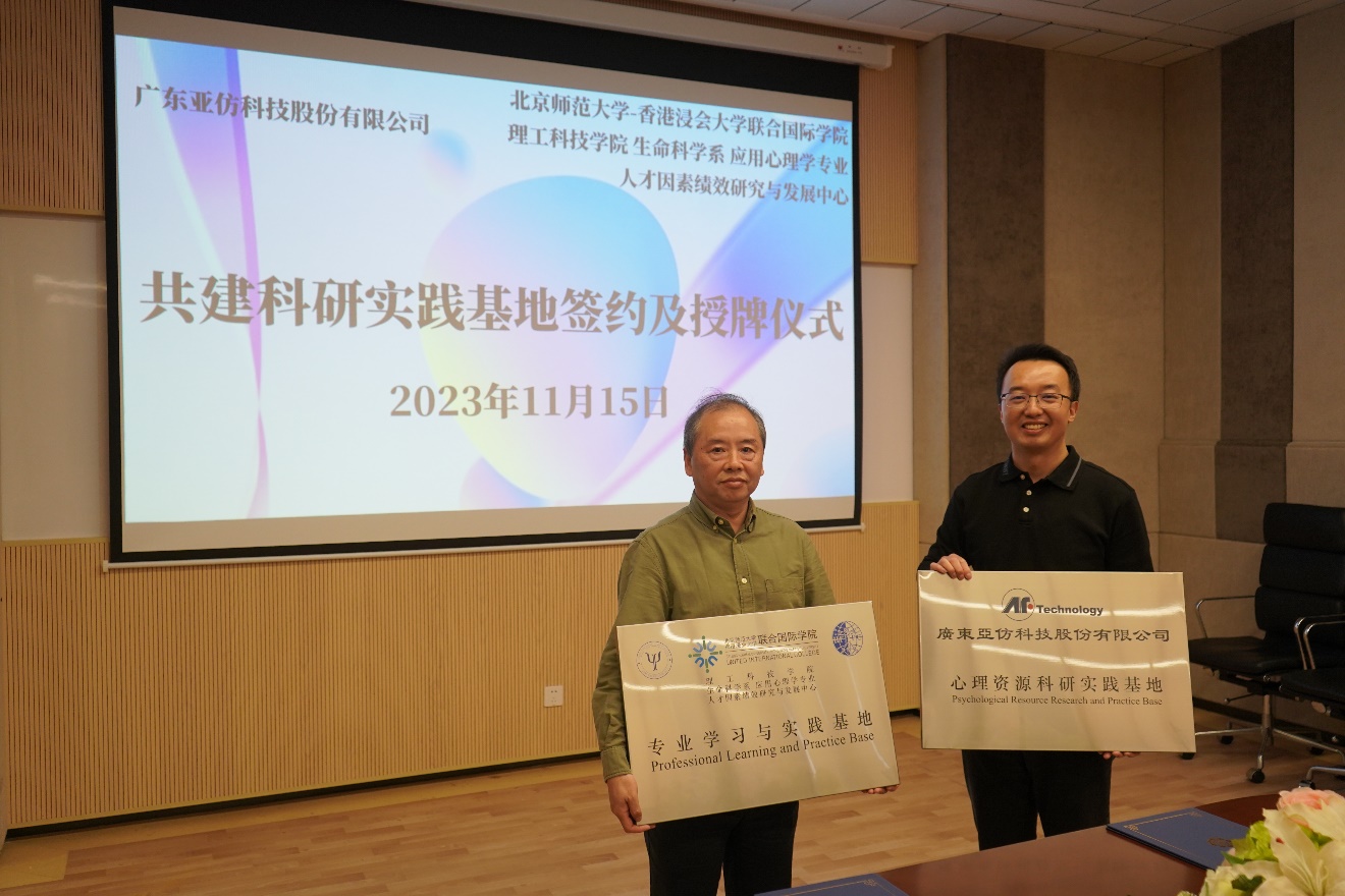 2023年11月15日,北京师范大学-香港浸会大学联合国际学院(北师港浸大)理工科技学院生命科学系应用心理学专业与亚仿科技股份有限公司共建科研实践基地签约及举行授牌仪式。