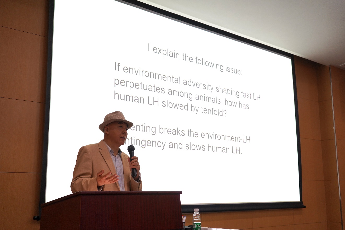 接下来,张教授阐述了生命史与养育的理论关系。在威胁性较强的环境中,生物会选择较快的生命史策略,例如高风险行为。但养育打破了环境与生命史的链接,帮助后代抵御生存威胁,从而减缓了后代的生活节奏,使其更关注长期效益、学习、合作与利他等。