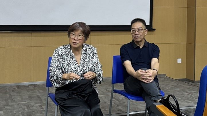 Bonnie Lee教授(左)和黄匡忠教授(右)与同学们一起交流