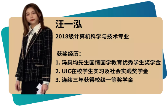 敢于跳出舒适圈,努力终得回报。入读UIC时,我原本是被食品科学与工程专业录取,后来在大一的计算机课程上,我开始对编程和设计网页产生了浓厚的兴趣。大一下学期,我转专业成为了计算机科学与技术专业的学生。为了赶上课程进度,每堂课前我会通过视频与教材预习。其中看得最多的是操作系统课,除了在课堂上认真听讲,我还旁听了另一个班级同样的课程,巩固知识。遇到困难,我会经常向老师、同专业优秀的同学请教,在他们的帮助下快速适应专业课程。