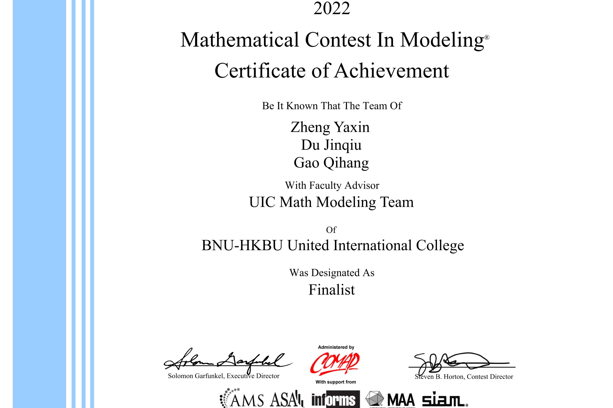 A total of 29 teams of UIC students won awards in MCM, including one Finalist (From the Statistics programme: Zheng Yaxin, Du Jinqiu, Gao Qihang), seven Meritorious Winner and 21 Honorable Mention, creating a record number of awards.