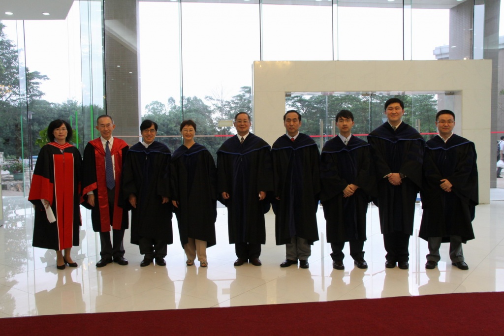From Left to Right: Dr. Karen Poon (Programme Coordinator, Food Science and Technology), Prof. S.Y. Zee (Dean, Division of Science and Technology), Prof. K.F. So (Academician, Chinese Academy of Science, Guest Speaker), Mrs. So, Prof. J.Z. Zhang(Professor, Statistics), Prof. G.F. Zhang (Academic Registrar), Dr. Ricky Hou (Associate Dean, Division of Science and Technology), Dr. Vincent Yeung (Associate Dean, Division of Science and Technology), Dr. H.P. Guo (Programme Coordinator, Computer Science and Technology).