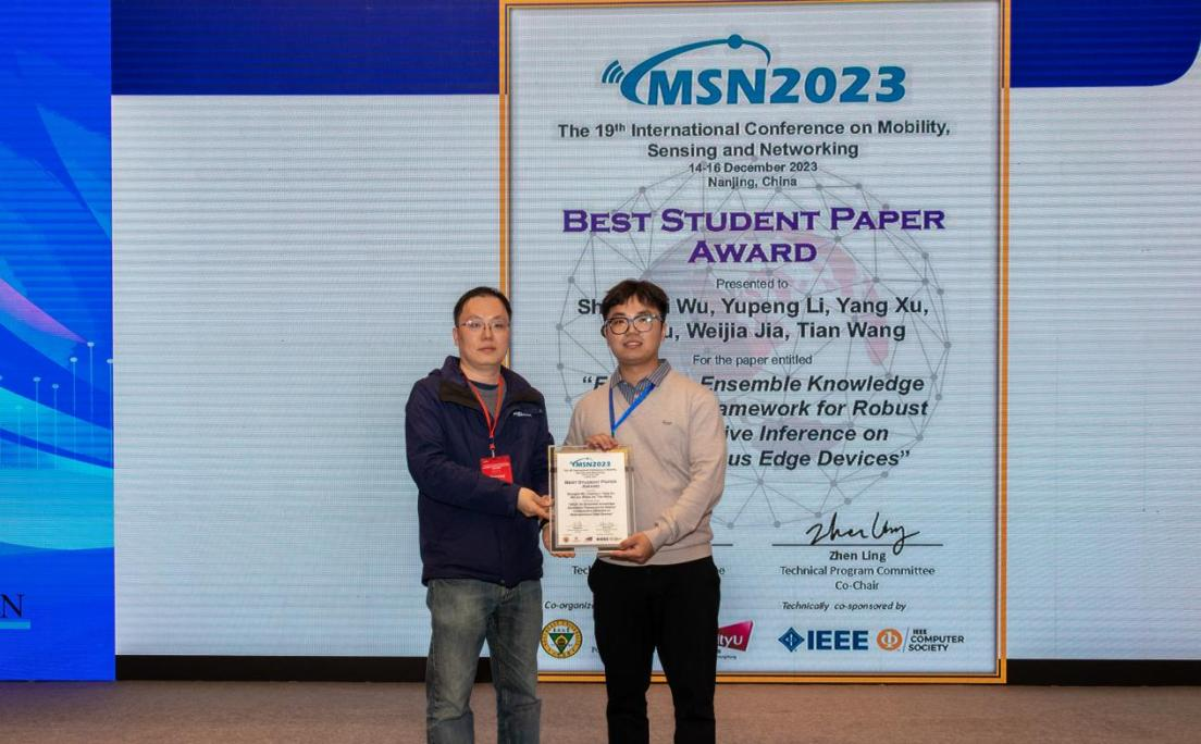 At the 19th International Conference on Mobility, Sensing and Networking (MSN 2023), a team led by the second-year PhD student Wu Shangrui of the Department of Computer Science and instructed by Prof Wang Tian won the Best Student Paper Award. The awarding paper, "EKDF: An Ensemble Knowledge Distillation Framework for Robust Collaborative Inference on Heterogeneous Edge Devices", presents an innovative framework EKDF.