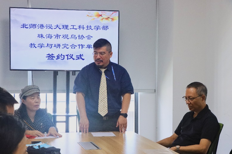 2021年10月20日上午,珠海市观鸟协会一行五人在郭竣工会长的带领下前来北师港浸大,与理工科技学部环境科学专业签订教学与研究合作协议,并举行挂牌仪式。