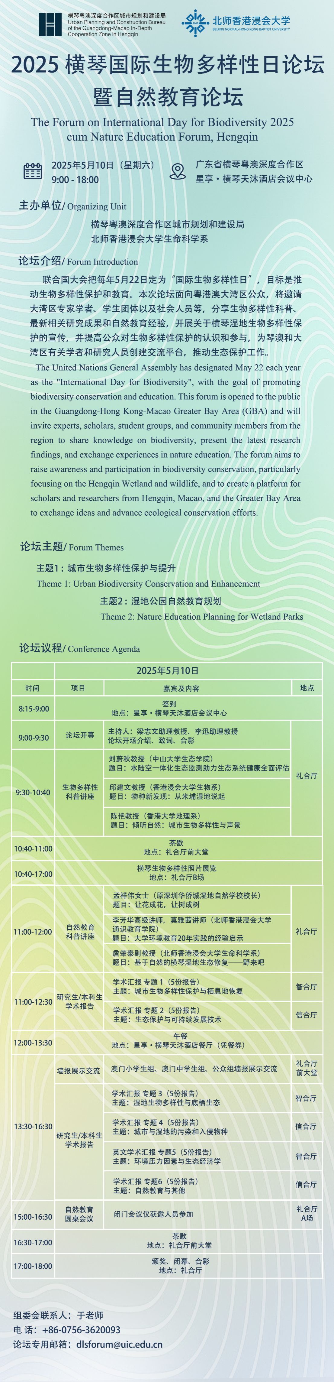 为迎接“5.22国际生物多样性日”的到来,本校生命科学系荣幸获得横琴粤澳深度合作区城市规划和建设局委托,联合组织举办的"2025横琴国际生物多样性日论坛暨自然教育论坛",将于5月10日在横琴粤澳深度合作区(以下简称深合区)召开。