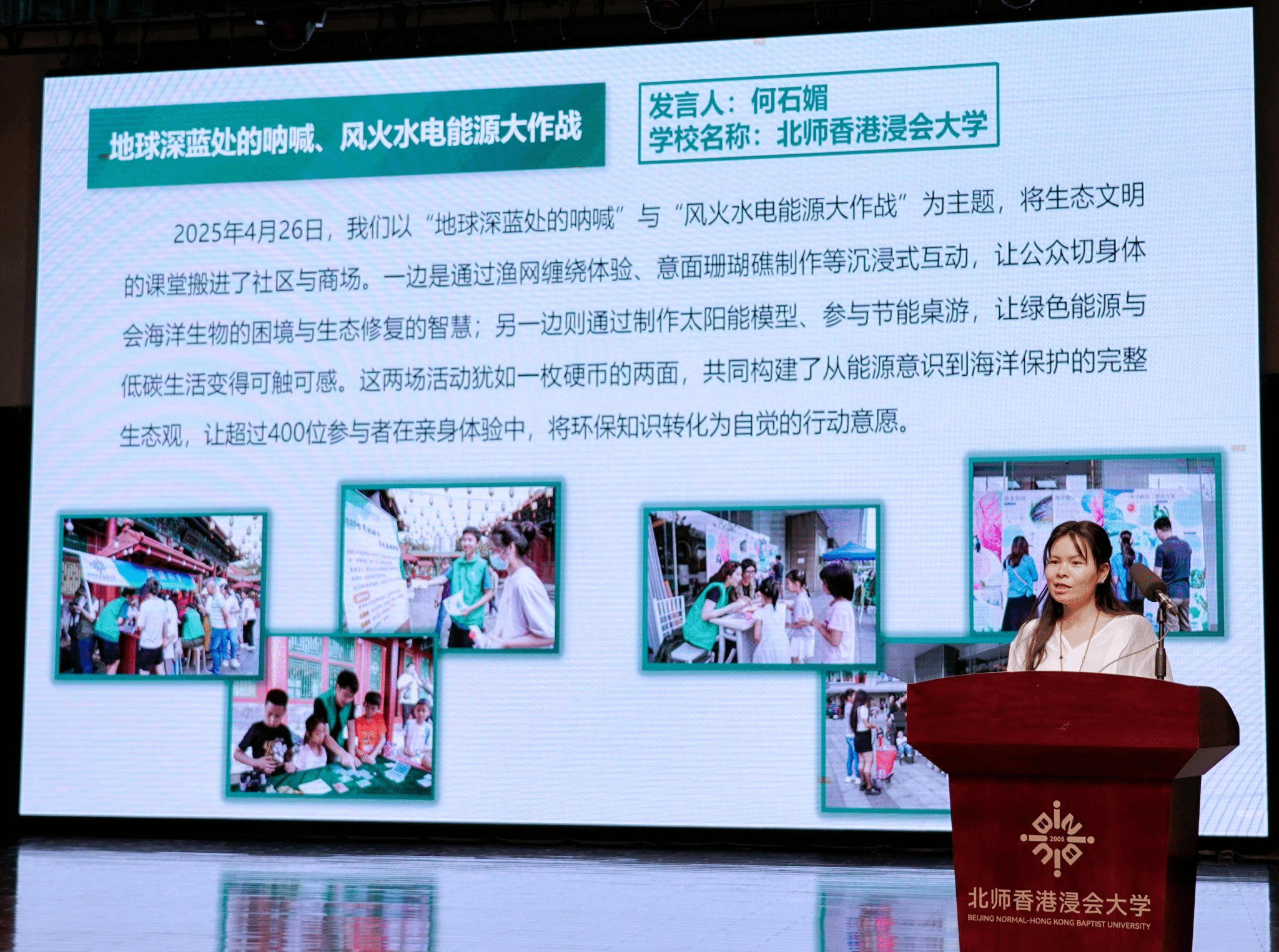 10月31日,在北师香港浸会大学(简称“北师港浸大”或“BNBU ”)召开 的珠海生态文明高校行动联盟(以下简称“联盟”) 2025年总结研讨会上,北师港浸大环境科学专业(以下简称“环科”)何石媚老师作为项目代表发言,分享和总结了环科加入联盟开展活动的过程及其意义。最后,两个小组活动“ 地球深蓝处的呐喊、风火水电能源大作战 ”获联盟项目杰出奖,环科任课老师詹肇泰博士和该项目负责人何石媚老师获评为优秀指导老师。
