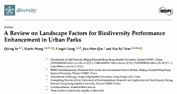 Recently, YE Qiting, a 2023 alumna of the Environmental Science Program of the Department of Life Sciences, Faculty of Science and Technology of the Beijing Normal-Hong Kong Baptist University (BNBU), published a paper as the first author in the MDPI journal, diversity, titled "A Review on Landscape Factors for Biodiversity Performance Enhancement in Urban Parks". The paper was based on her undergraduate thesis and was completed under the supervision of her advisor (and corresponding author of the paper), Dr. SiuTai TSIM.
