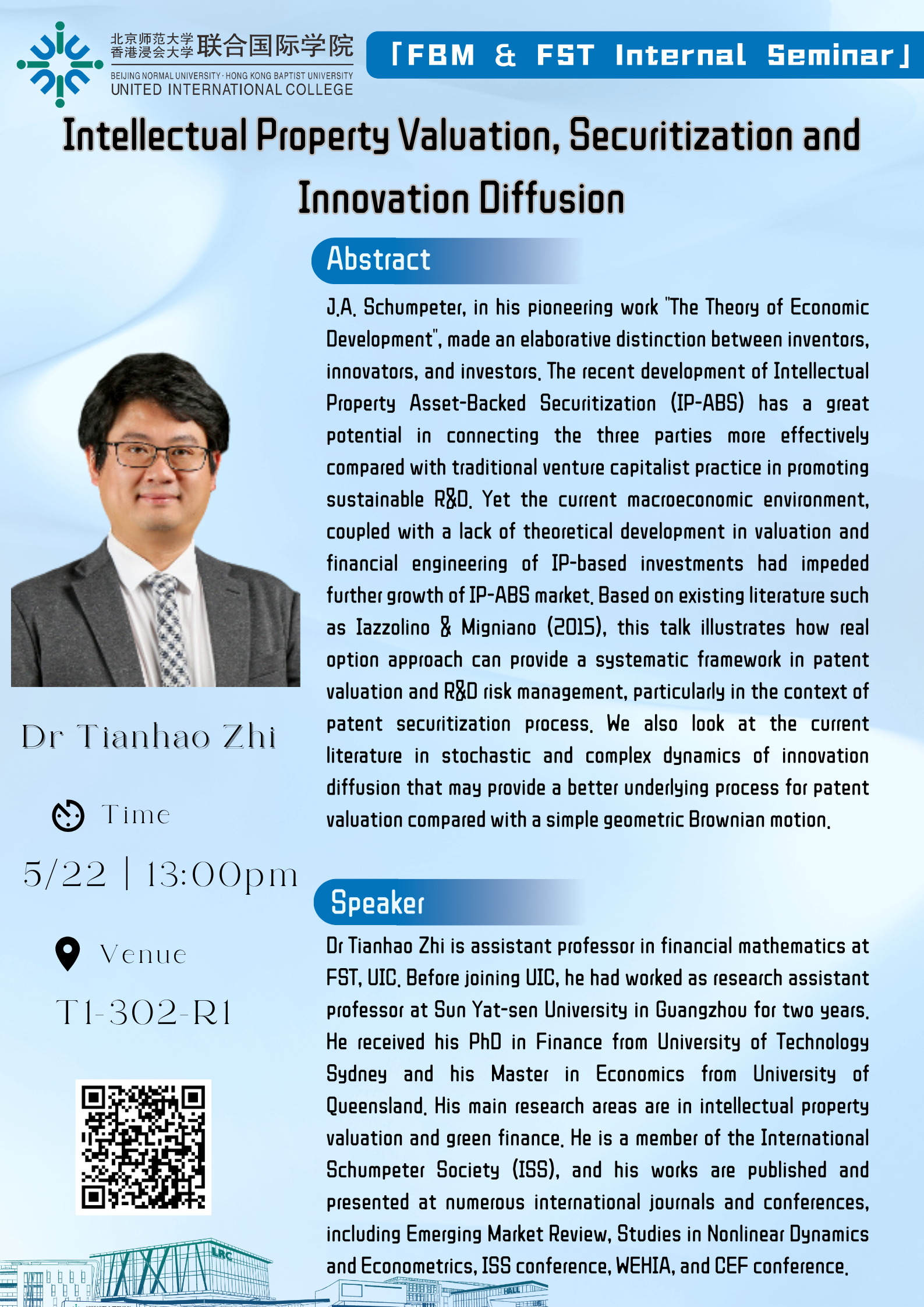智天皓博士目前在北师港浸大UIC理工科技学部担任助理教授职务。在他加入UIC之前,曾在中山大学管理学院做过两年特聘副研究员。他博士毕业于悉尼科技大学,硕士毕业于昆士兰大学。他的研究方向包括非线性经济动力系统,知识产权定价理论,行为金融等。他的论文曾在数个国际期刊和国际会议上发表和宣读过,包括Emerging Market Review, Studies in Nonlinear Dynamics and Econometrics, WEHIA, and CEF conference。