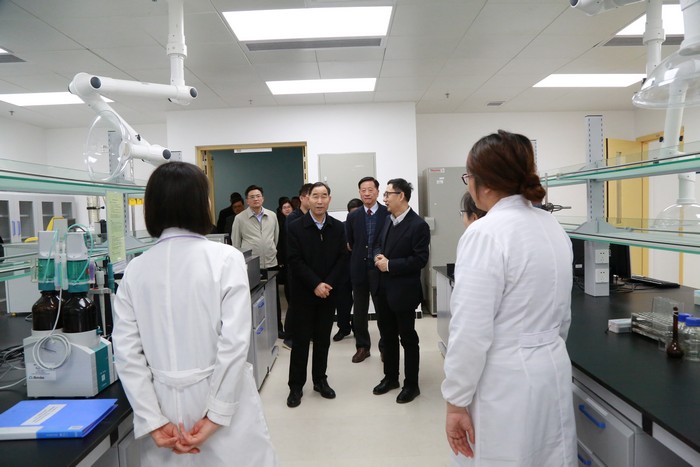 朱保成一行在吴清辉校长、雷波的带领下参观了食品科学与工程的食品加工实验室、食品科学研究实验室等教学实验室,健康食品开发实验室等研究实验室及检测中心。