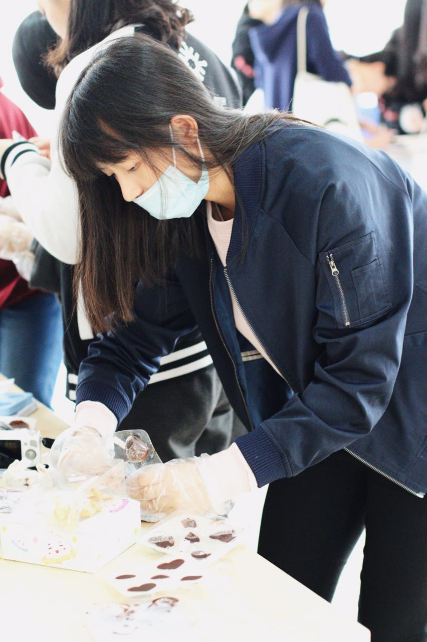 在这里,同学们自己动手将巧克力酱入模,待冷冻成型之后,他们还可以根据喜好撒上抹茶粉或者椰蓉。
