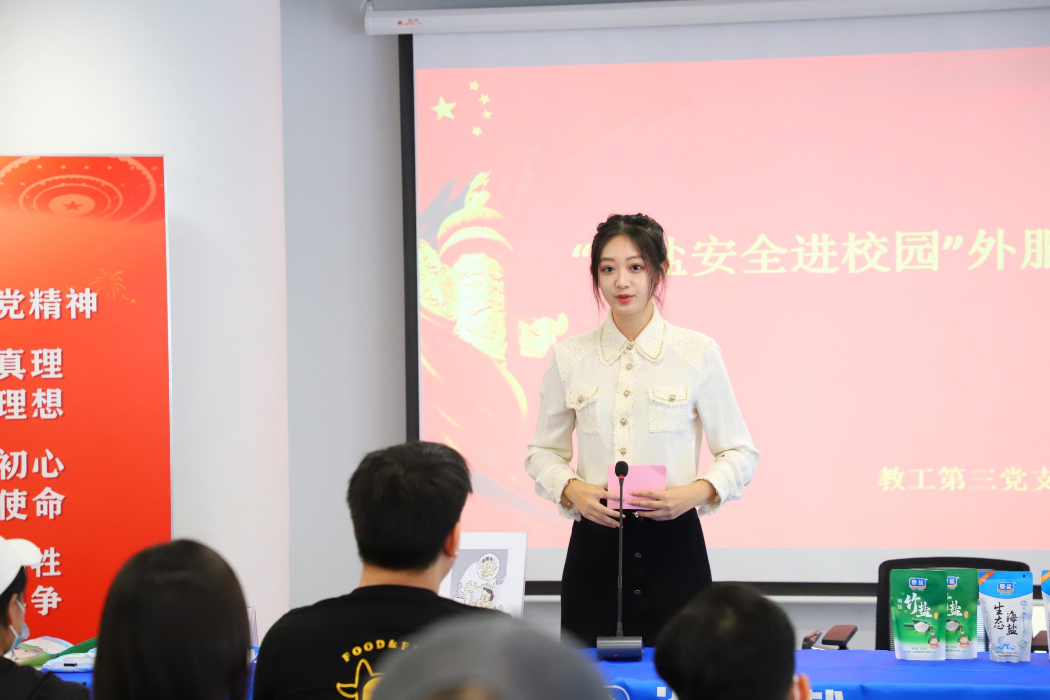 2023年3月11日,教共第三党支部、理工科技学院党支部联合珠海盐业集团党支部开展了“食盐安全进校园”科普宣讲会。活动由来自21届食品科学与工程专业的刘佳茵同学主持开幕,介绍了本次活动的主题以及出席嘉宾。本次活动以科普宣讲会的形式进行,科普安全用盐、科学补碘的相关知识,旨在拉进高校餐饮服务人员和学校的距离,增强他们的的获得感、幸福感与归属感,提高安全责任意识,为全校师生安全用盐保驾护航。广东省盐业集团珠海有限公司斗门分公司负责人陈国明,市区分公司副经理侯锐和高级客户经理廖汉作为嘉宾出席本次活动。