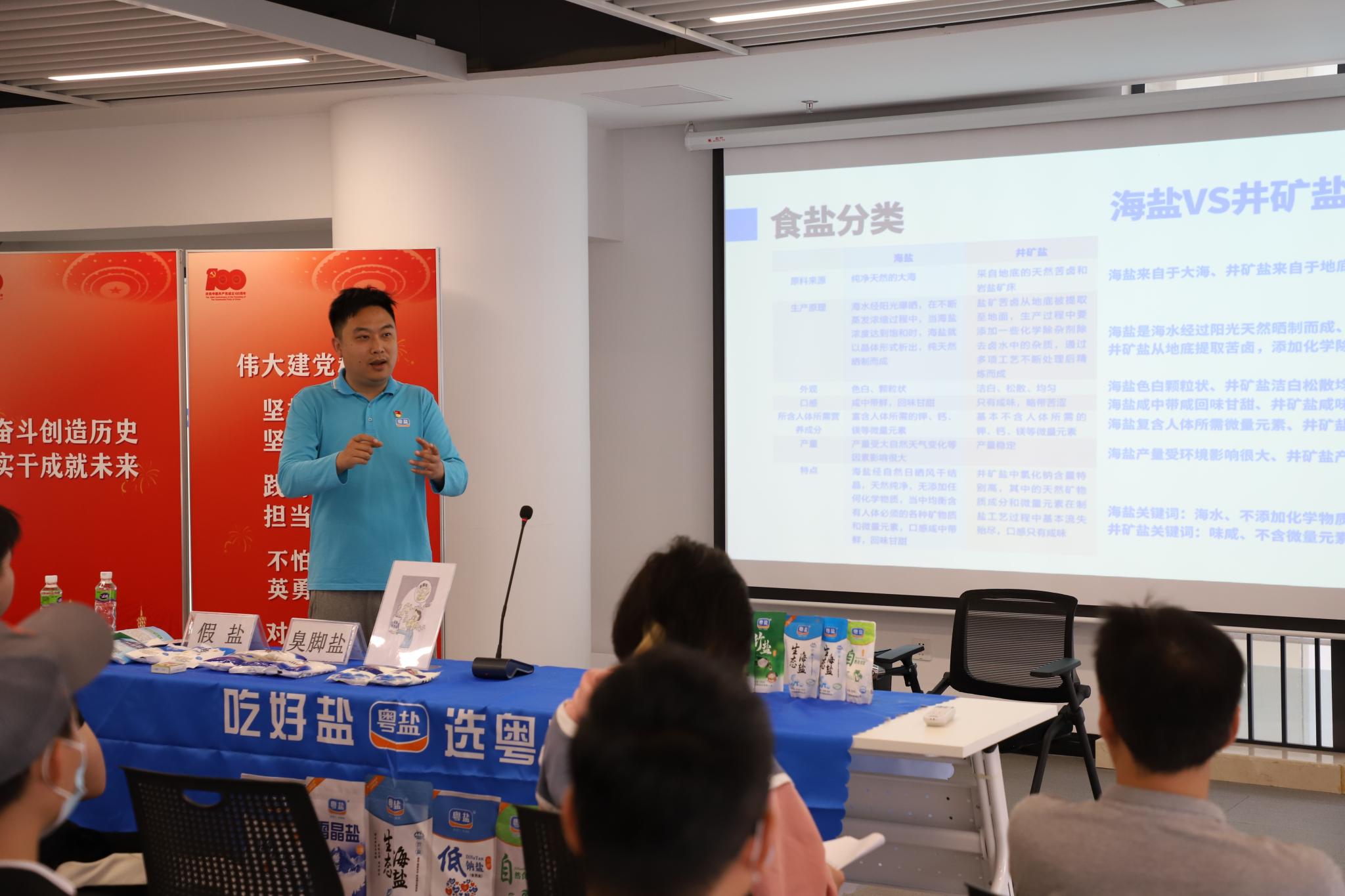 随后,主讲人廖汉通过幻灯片展示为在座的来宾介绍了食盐的相关法律法规及珠海市内的假盐案例,强调食盐安全的重要性。他讲解了盐对于各个年龄段人群的人体生长发育的重要性及影响,强调食盐在百姓生活中的重要地位—。作为一种国家的战略资源,食盐在生活中可谓是一日不可无。国家食盐储备和应急管理政策,让大家深切体会到国家和党组织对于百姓生活关心的细致入微,内心倍感温暖。