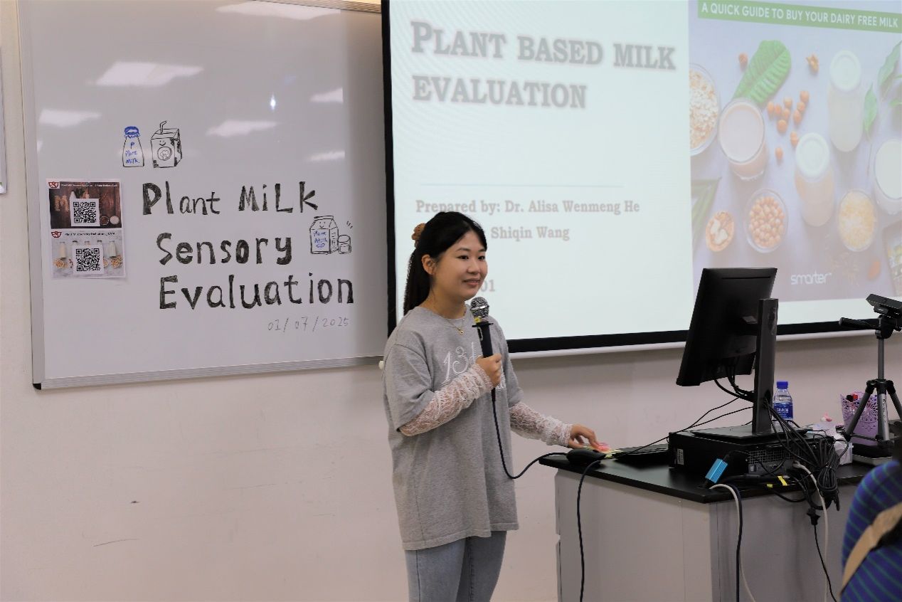 工作坊的最后环节,由硕士研究生王诗琴主持食品感官体验活动。她首先向学生们介绍了感官评价在食品研发中的作用和基本原理,随后组织学生亲身参与感官测试实践,体验不同食品在风味、口感、气味等方面的评价过程。学生们分组讨论,认真记录,并热烈交流感受,活动现场互动频繁、气氛活跃。