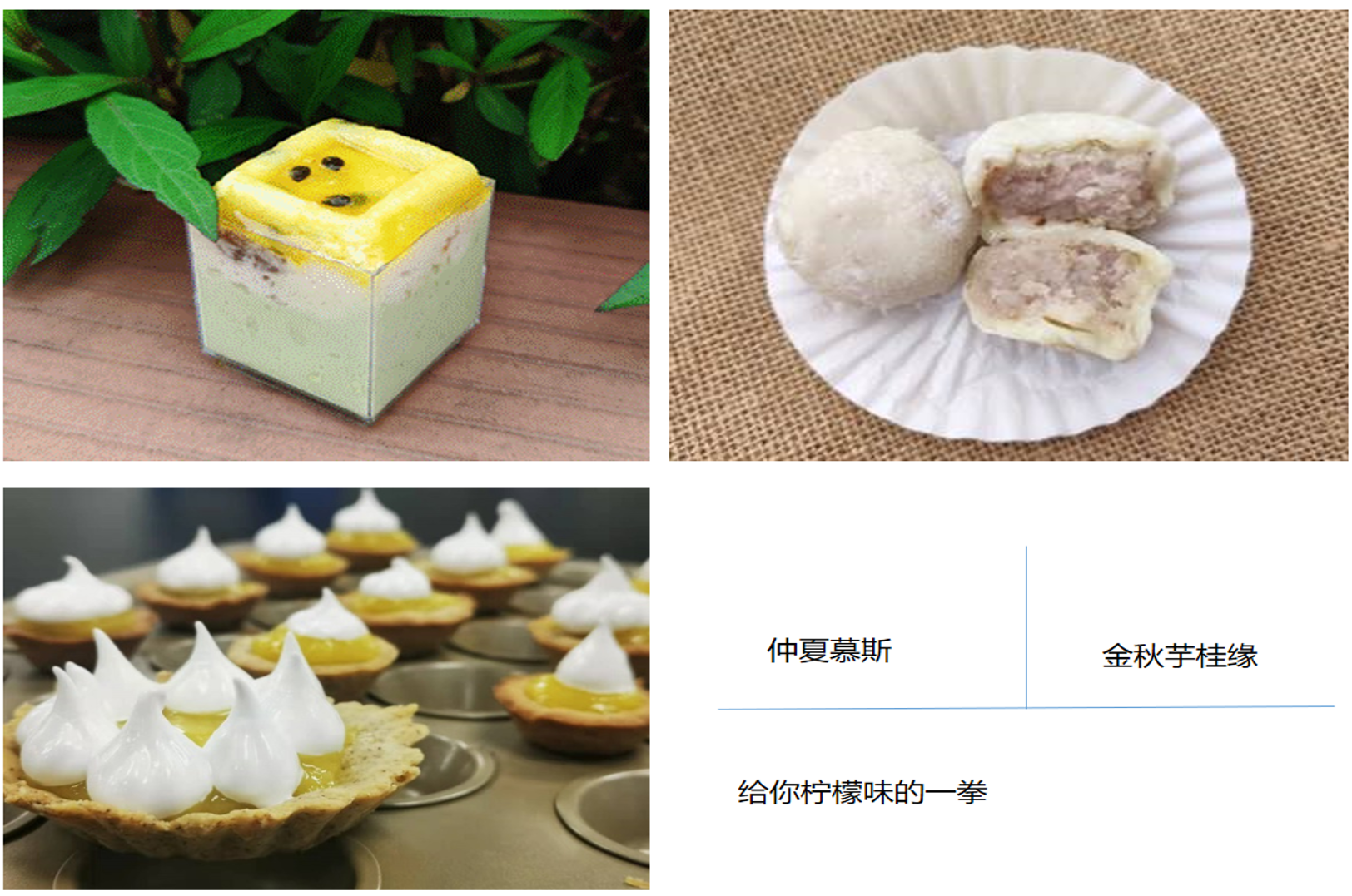 第三组产品:仲夏慕斯。仲夏之吻为你带来心动的感觉,百香果开心果与法式慕斯共舞,视觉和味觉都满是夏日的暖意。第四组产品:给你柠檬味的一拳。是柠檬的香气?是酥软的曲奇底托举着酸甜的柠檬酱与蓬松蛋白霜在舌尖碰撞。温热醇厚的红茶在旁静候,期待与您共度美好下午茶时光。第五组产品:金秋芋桂缘。柔滑芋泥搭配软糯米皮,佐以清香桂花,唇齿留芳,碰撞出金秋时节的奇妙缘分。炎夏里亦能品味秋高气爽!