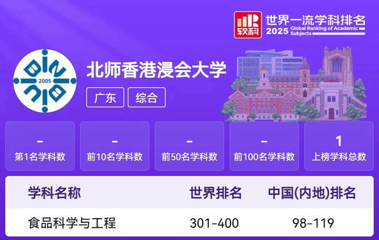 近日,高等教育评价机构软科(ShanghaiRanking)发布2025世界一流学科排名。北师香港浸会大学(BNBU)食品科学与工程学科首次入选榜单,标志着该学科在国际范围内竞争力显著提升。
