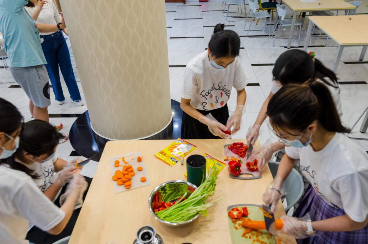 “洗净、削皮、切片……”全程戴手套操作。心灵手巧的食品专学女生们纷纷化身“厨房小当家”,处理食材起来一丝不苟。萝卜、甜椒、西芹、黄瓜、小番茄……对食材的选用,食品专业学生不仅兼顾了营养价值也确保了游戏的趣味性,希望同学们在玩得开心的同时也能关注到这些果蔬的营养价值。