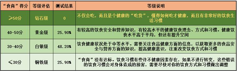 “食商”是食品科学专业师生新造词汇,借用智商和情商的概念,在“食商”测试环节,参与者需要完成2部分关于 “吃”的测试,最后通过计算得分查看自己的“食商”等级。测试结果(如下)显示近75%的“食商”测试参与者的饮食健康状况处于中等及中等以下水平,初步调查结果预示民众对自己的饮食、健康及饮食与健康的关系关注度非常低,饮食消费还基本停留在“吃饱”和“美味”的水平上,食品科学知识的全民普及任重道远。