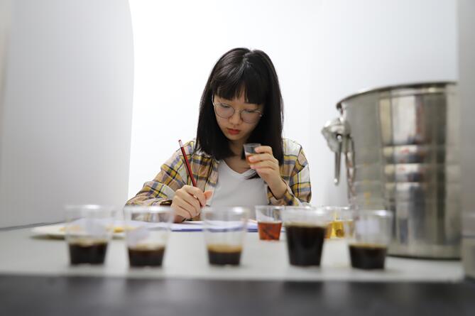 在实验室中,参与者认真品鉴每一款茶和咖啡,并且记录闻香、品香的感觉,进行专业评测。