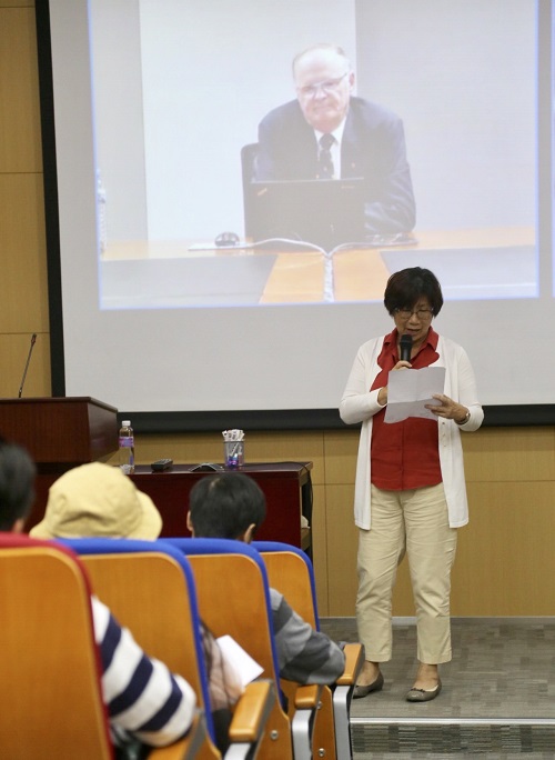 Prof Miller speaking to the audience via video conferencing technology