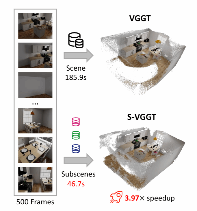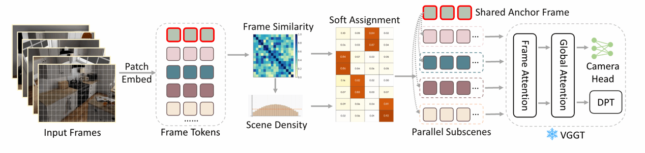 为突破这一速度瓶颈,研究团队提出了新方法 S-VGGT。不同于以往局限于压缩局部特征的思路,S-VGGT 直接从“全局图像序列”的宏观视角切入:它先利用模型自身的中间信息,将高相关画面划分为保留空间结构的“子场景”;随后通过共享参考帧,让各子场景在统一坐标系下实现高效的并行处理。这一巧妙设计在不损失重建质量的前提下,成功实现了处理速度的显著跃升。