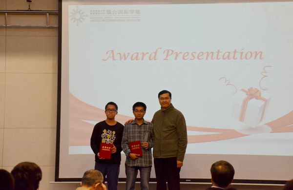 副校长徐是雄教授、协理副校长陈孟贤教授在祝捷上分别为两个比赛的获奖团队颁发奖状。出席此次祝捷分享会的还有教务处长张根发教授,理工科技学部院长钟森文教授,指导老师、计算机科学与技术专业的唐新民博士和张慧博士,以及来自计算机专业的学生。