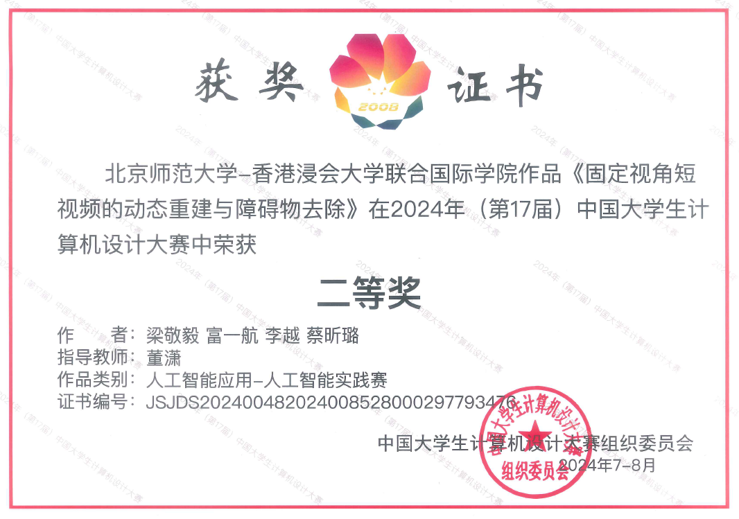 近日,2024年(第17届)中国大学生计算机设计大赛获奖名单公布,UIC理工科技学院梁敬毅、富一航、李越、蔡昕璐团队的作品《固定视角短视频的动态重建与障碍物去除》和于佳鹏、罗恒艺、汪子轩、吴宇谦、王舒民团队的作品《CNO-Former:基于混沌神经振荡自注意力机制的文本生成模型》荣获大赛国赛二等奖。