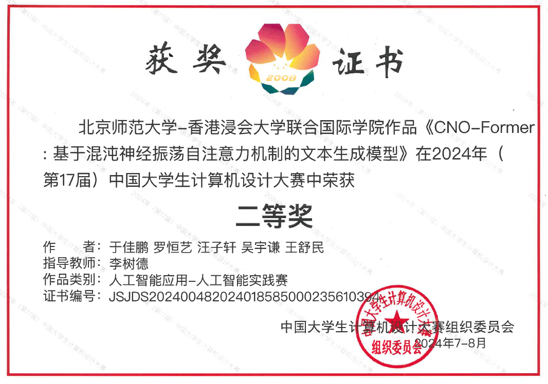 团队成员于佳鹏分享道:“参加此次计算机设计大赛是我们团队展示CNO-Former模型创新性和应用潜力的绝佳机会。我们的目标不仅是验证模型在文本生成领域的性能,更是探索其在大模型领域的深远影响。在加入研究团队之初,我便对李树德博士在混沌理论领域的研究充满好奇,并在李博士的悉心指导下,深入探索了混沌神经振荡在深度学习中的应用。面对项目中未曾接触过的技术难题,团队并未气馁。在遇到技术挑战时,李博士总是能够及时提供专业的指导和建议。他的深入见解帮助我们突破了多个瓶颈,深化了我们对模型的理解。在李博士的引导下,我们制定了针对性的学习计划,不仅涵盖了必要的理论知识,还包括了实践操作和问题解决技巧。李博士敏锐的洞察力,为我们的项目指明了方向,确保了每一步都明确有效。”