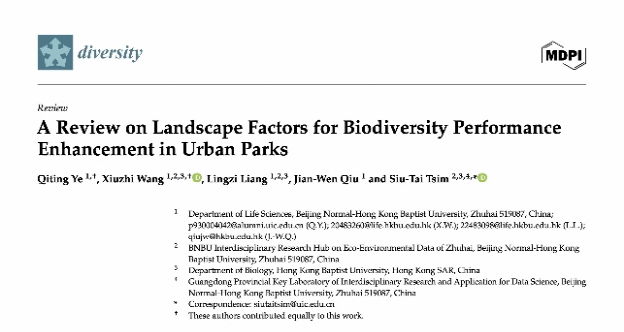 近日,北师港浸大(BNBU)理工科技学院生命科学系环境科学专业2023届校友叶绮婷以第一作者身份在MDPI期刊《diversity》上发表了题为《A Review on Landscape Factors for Biodiversity Performance Enhancement in Urban Parks》的论文。该论文是基于其本科毕业论文,在导师(也是该文的通讯作者)詹肇泰博士的指导下完成。