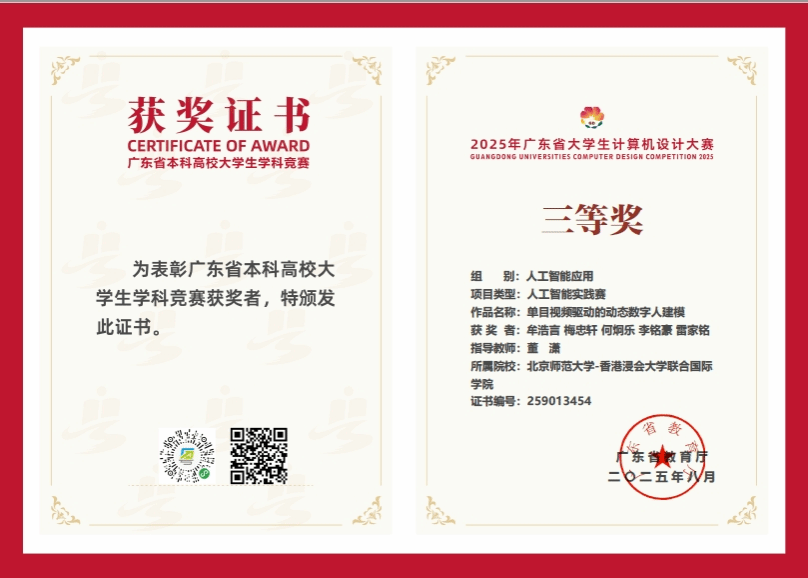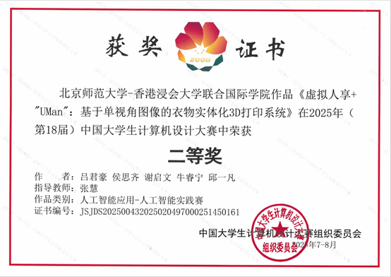 近日,2025年(第18届)中国大学生计算机设计大赛获奖名单公布,BNBU理工科技学院计算机科学系吕君豪、侯思齐、谢启文、牛睿宁以及工商管理学院会计系邱一凡组成的团队的作品《虚拟人享+“UMan”:基于单视角图像的衣物实体化3D打印系统》荣获大赛国赛二等奖。