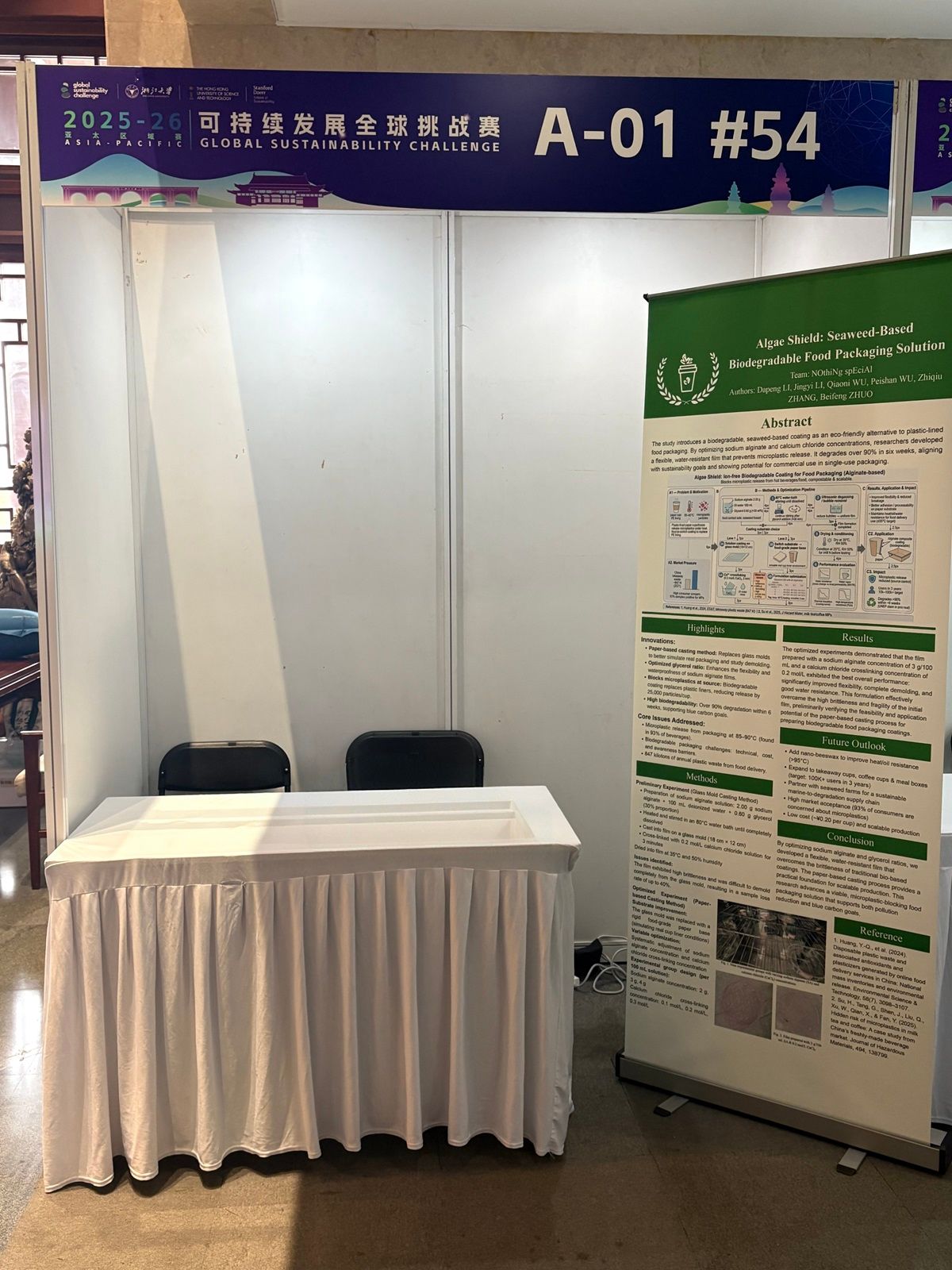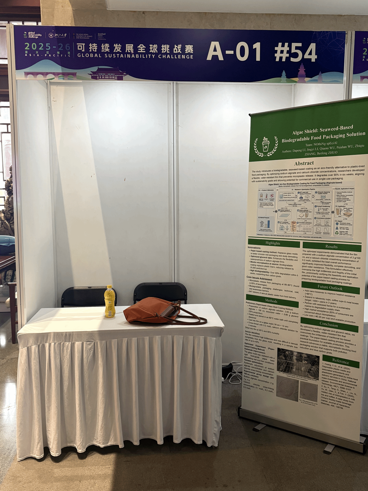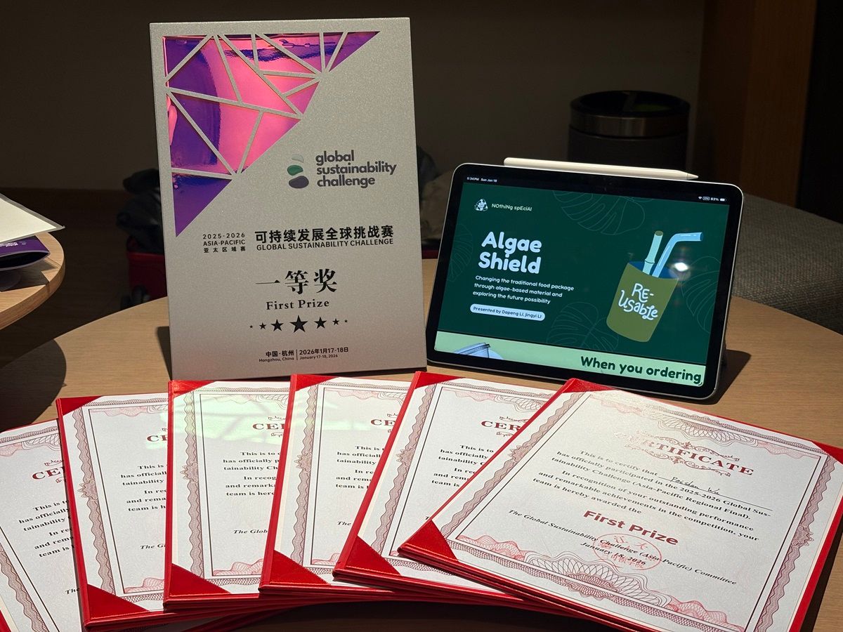 2026年1月18日,由斯坦福大学发起、浙江大学与香港科技大学联合主办的Global Sustainability Challenge(可持续发展全球挑战赛)亚太区域赛在浙江大学顺利落幕。由北师香港浸会大学(BNBU)理工科技学院生命科学系环境科学专业五名大二学生李达鹏、卓蓓枫、李静依、吴俏霓、邬佩珊作为核心成员的团队表现出色,凭借创新项目“藻盾食安(Algae Shield)”在激烈的比赛中脱颖而出,一举斩获亚太区一等奖。