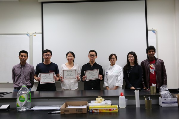 徐宝军教授(左一)为“米菲蛋糕”制作团队(陈景龙、黄梦琪、徐东堃)颁“最具商业价值奖”,FST课程主任胡美怡博士(右二)、助教Mohammad Tahidul(右一)、肖映霞女士(右三)与获奖者合影