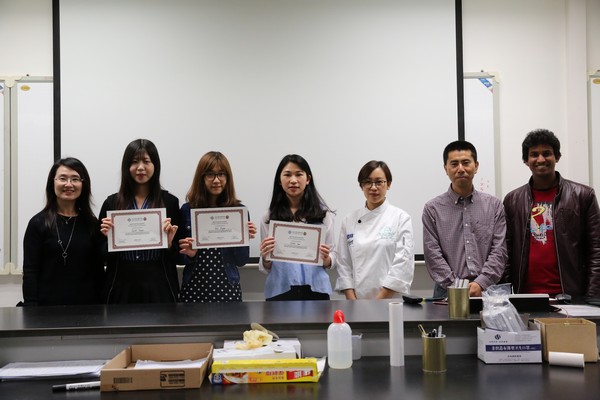 徐宝军教授(右二)为“富士山冰淇淋”制作团队(许紫云、郭佳悦、高玥)颁“最佳食品奖”和“最佳海报奖”,FST课程主任胡美怡博士(左一)、助教Mohammad Tahidul(右一)、肖映霞女士(右三)与获奖者合影