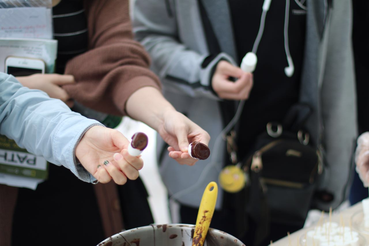 场馆内的巧克力喷泉也吸引了很多学生,黑巧克力配上棉花糖就会减弱苦味,裹着巧克力酱的棉花糖和手指饼干变得非常诱人。