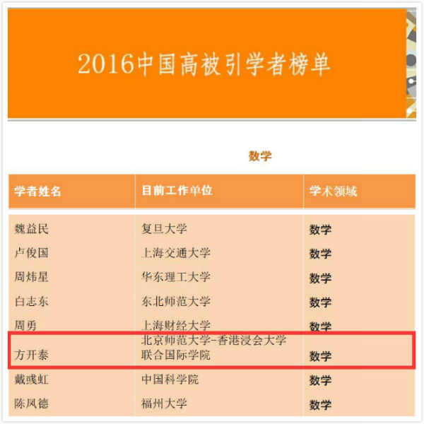 学术出版巨头爱思维尔(Elsevier)于2月27日发布了2016年中国高被引学者(Most Cited Chinese Researchers)榜单,共收录一千七百余名最具世界影响力的中国学者。其中,UIC统计学专业的方开泰教授入选数学学科榜单(共86人)。