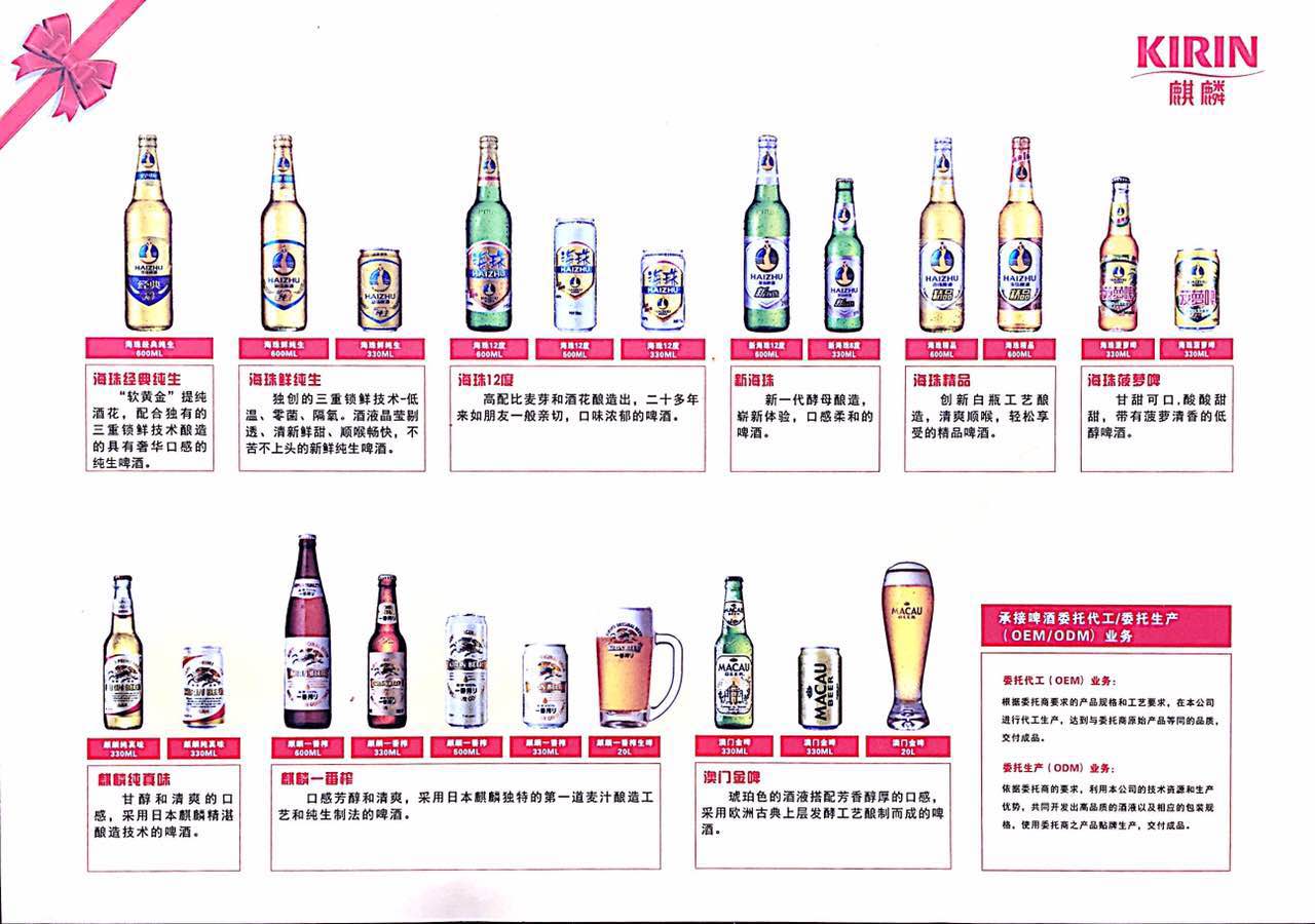 麒麟啤酒(珠海)有限公司创立于1996年,并不断致力于(CSR)企业社会责任体系建设,期间通过了ISO9001, GB/T 19001以及OHSAS 18001体系认证。麒麟啤酒主要分为三个品牌:麒麟啤酒,海珠啤酒,以及澳门啤酒。