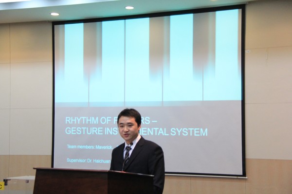 获奖学生代表林暄同学现场为嘉宾和观众们详细讲解了他们的参赛作品《指尖旋律——手势音乐演奏系统》(rhythm of fingers)。他以流利的英语介绍了创意的来源、制作的过程以及所采用的技术。