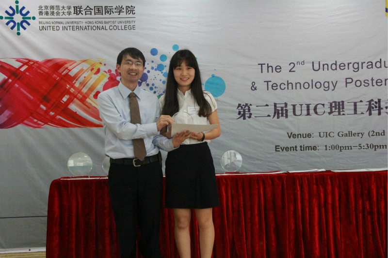 理工科技学部副院长候远坦博士为获得最受学生欢迎海报奖的李昱菡同学颁奖