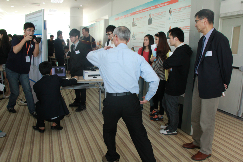当天A区2楼展厅熙熙攘攘,挤满了前来观展的师生。一台同学自制的3D打印机正在打印UIC LOGO 3D模型,吸引了很多同学围观。
