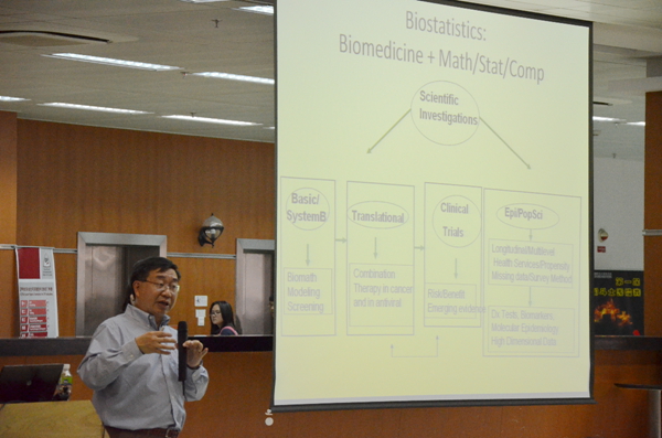 谭教授以生物统计学的基本知识开始了他的讲座。他说:“生物统计学,简而言之,主要是由生物医药学外加数学、统计的知识组成。”通过建模等方式,用数据分析案例,比方说某种药物能否投放市场,是需要经过数学和统计分析的。
