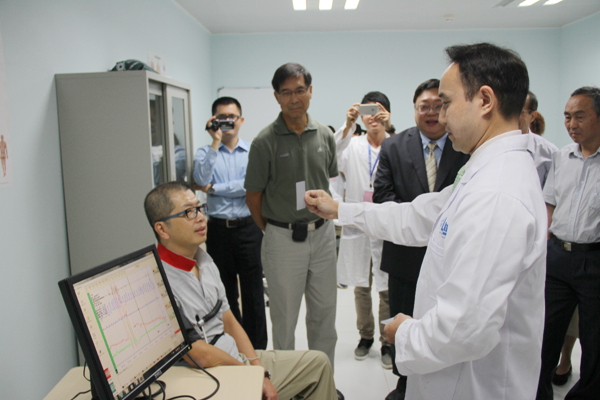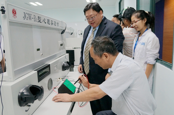 仪式结束后,嘉宾开始走访实验室,了解仪器设备的情况。每个实验室都有应用心理学专业的老师和学生向嘉宾详细介绍仪器的功能,并做相关的演示,不少嘉宾还亲自体验。记者也随同采访,多方了解这个新生事物。