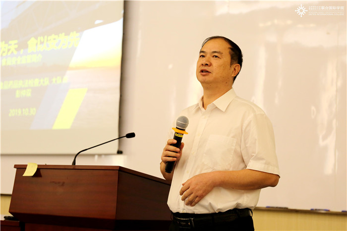 当天下午,珠海市食品安全协会会长黄腾邈与高新区市场监督管理局执法大队大队长彭仲双在校内开展了食品安全知识讲座。在讲座中,黄腾邈会长为大家列举了一些食品中毒的例子,也回顾了很多重大食品安全事故,如“毒奶粉”“瘦肉精”事件,并分享了一些执法过程中的见闻。彭仲双大队长则为同学们展开了题为“民以食为天,食以安为天”的讲座,系统地科普了一些食品安全的概念。讲座后,同学们也不愿错过学习的机会向两位嘉宾请教。
