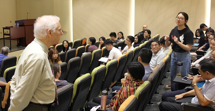 在讲座的最后,本特勒教授与师生进行互动,方开泰教授、彭小令博士、Elsawah博士以及学生们都积极提问,学术氛围浓厚。本特勒教授表示以后有机会,会考虑来UIC举行研讨会,现场观众非常开心。
