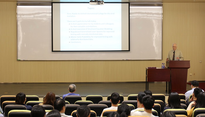 6月28号下午,应UIC理工科技学部邀请,加州大学洛杉矶分校著名统计学家、心理学家彼得·本特勒教授,为UIC师生们带来了题为 “Regularized GLS and Monte Carlo Probability for Improved Structural Equation Model Evaluation(改善结构方程模型评估的改进广义线性模型和蒙特·卡罗模拟数据分布)”的精彩前沿学术讲座。讲座由UIC应用心理学课程主任何义炜博士主持,UIC校长吴清辉教授、理工科技学部院长钟森文教授、统计学专业方开泰教授、统计学专业课程主任贺平博士、金融数学课程主任周哲芳博士以及统计专业和应用心理学专业的师生一起聆听了此次讲座。