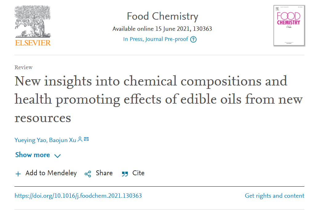 2021年毕业季,食品科学与工程专业(FST)大四学生姚玥莹以第一作者身份在食品科学和分析化学领域的著名国际期刊Food Chemistry上在线出版了一篇SCI论文《新资源食用油的化学成分和健康促进作用的新见解》。食品科学与工程专业课程主任徐宝军教授为本论文的指导老师及通讯作者。
