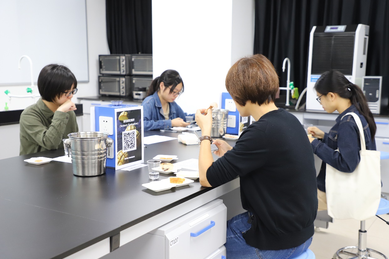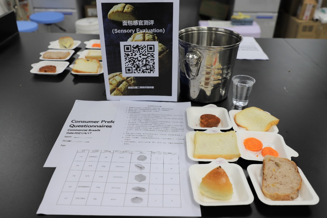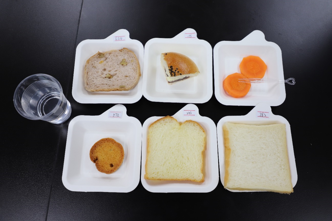 本次感官评鉴涉及到多种烘焙类产品:乳香片、皇后吐司、法式香橙核桃、生吐司和冰心维也纳为金元朗公司提供。消费者对面包的喜好度,可接受程度可以为面包的外观和口感优化提供直接性指导意见。在感官评鉴中,测试者需根据五款不同面包的外观,香气,质构,味道和价格进行喜好度评价,同时对面包的整体可接受程度进行评分。由于参与人数较多,FST为本次产品品鉴活动开放了食品加工实验室以及标准感官实验室进行面包感官评测。测试者在对面包品鉴的同时,也对食品科学与工程专业的评测流程和专业内容有了更进一步的了解。