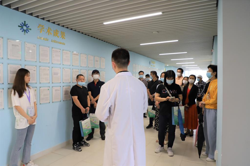 刘东城博士研究生为校园开放日前来参观和体验的家长及高中生介绍实验室