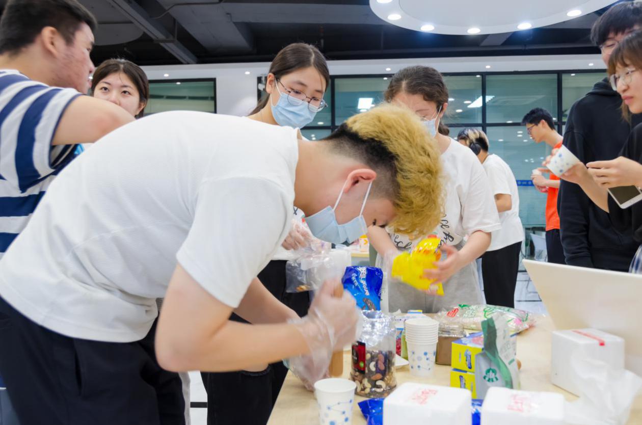在“套圈得食材”现场,排起了长龙队。为了这次活动,我们食品专学准备了丰厚的奖品,一等奖的辛拉面,二等奖的辣条成功吸引了很多同学前来参与。在参与游戏的同时,参与者可获得一颗积分糖果,用于参与后续的心动角和冰淇淋DIY活动。