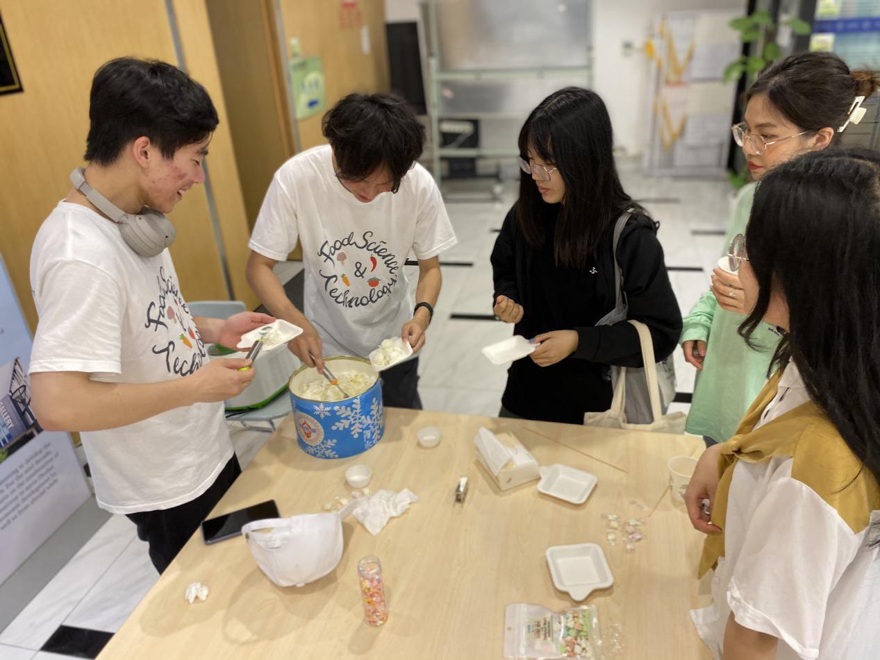 在冰淇淋摊位,同学们可通过前面活动中获得的积分兑换一份冰淇淋。参与者可以根据个人喜好,使用现场提供的葡萄干、奥利奥碎、抹茶粉、可可粉进行DIY制作。
