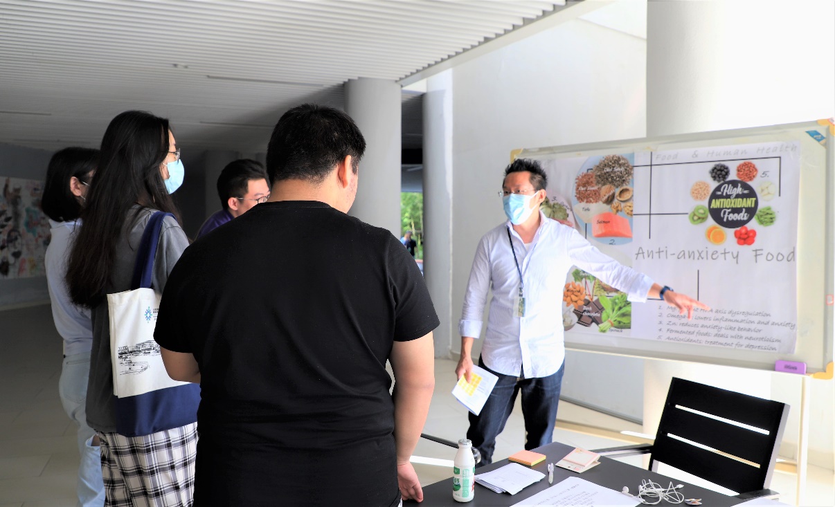 本次活动抗衰老和抗压力的海报讲解,由食品科学与工程专业谢启荣博士和部分大一学生志愿者进行讲解,通过简单易懂的词汇让参与者们对各种食物的营养价值有更深一步的了解,并获取关于生活和饮食丰富的科普小知识。