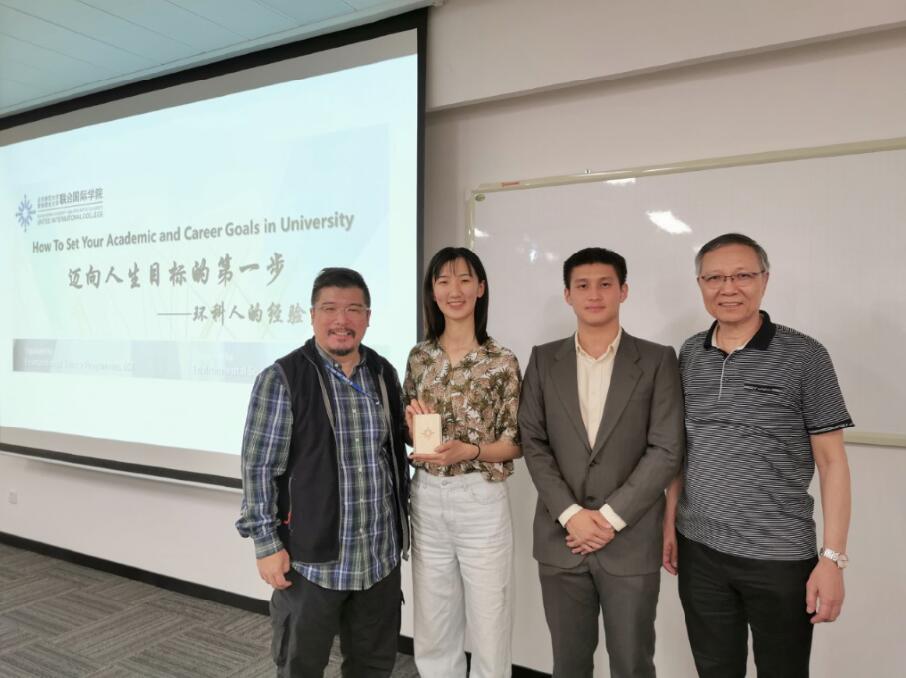 随后环境科学大四学生李俊杰进行了分享。李同学是NGO组织中国青年应对气候变化行动网络(China Youth Climate Action Network,CYCAN)的一员,中国生态环境部全国低碳日青年代表之一;同时,他也是UIC领导力钻石奖章获得者。他首先分享了自己在CYCAN结识到很多志同道合致力于环境保护的朋友,一起为环保事业奋斗的经历,然后分享了作为中国青年代表参加联合国举办的国际峰会的宝贵经验,以及自己对于后续工作的一些展望与规划。鼓励学弟学妹们要明确自己的兴趣和目标,通过专注学业、参加社团活动来提升自己的综合实力。最后建议大家要有选择性的选择校内的活动参加去提升背景提升自我价值。